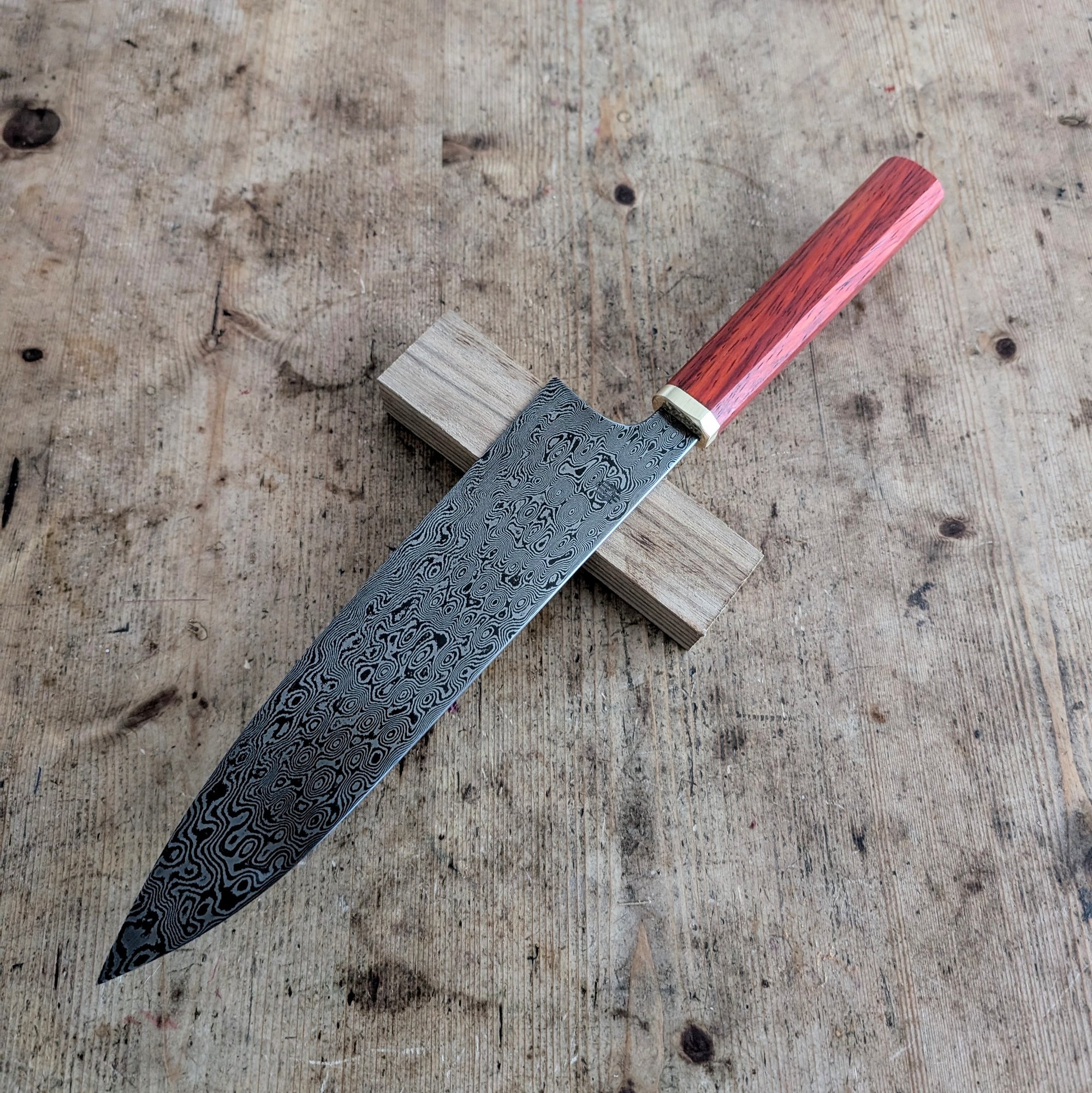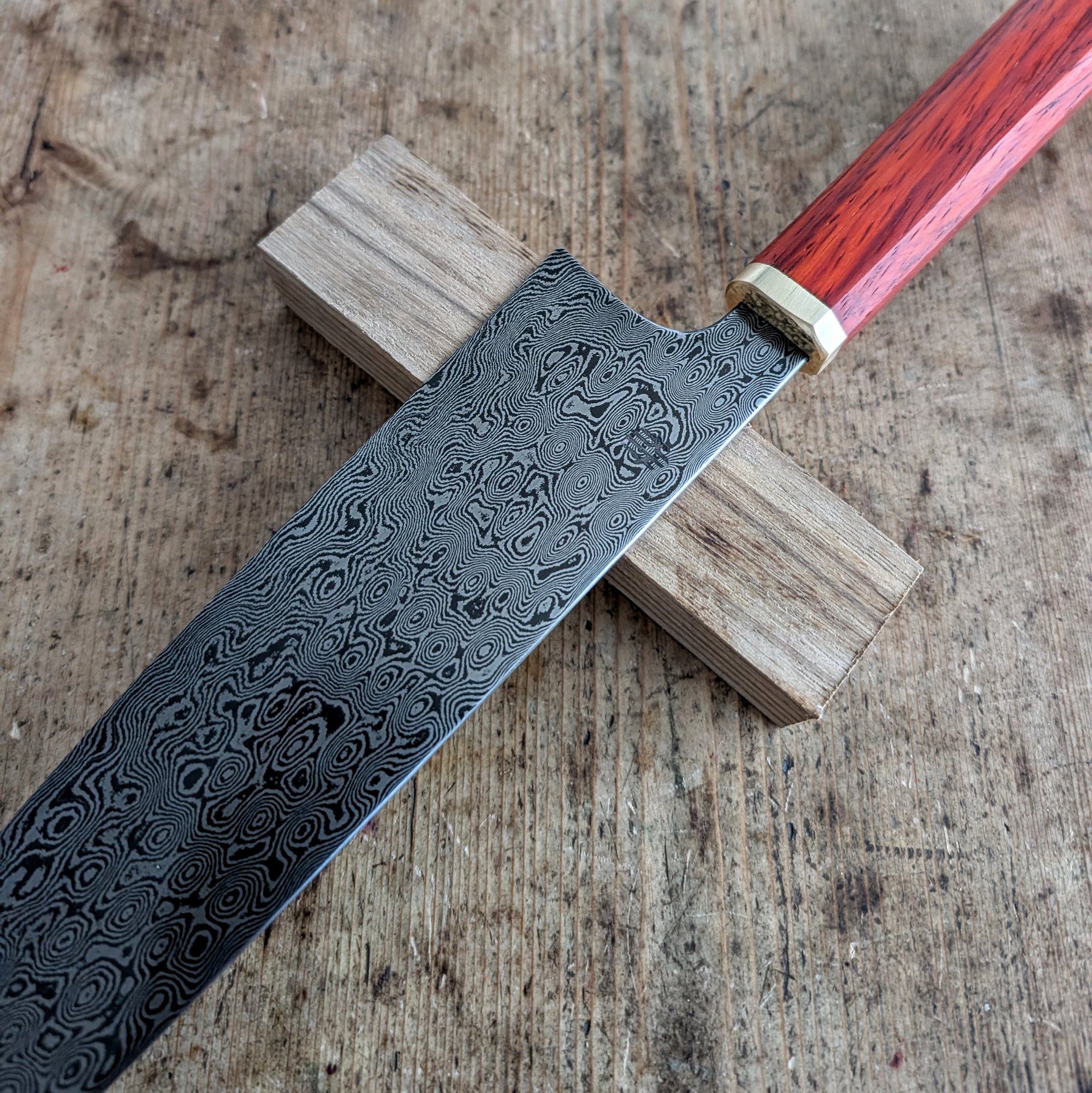 Carbon damascus gyuto made out of pattern welded 1095 & 15n20 steel at 62 Rockwell. Convex grind. Polished spine & choil, convex grind. Paduk & brass handle ( rokkaku hanmaru shape)